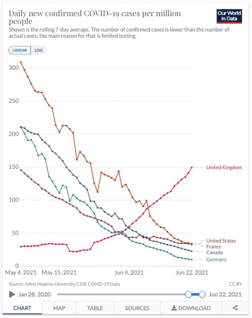 This is now 12 days old so the level has shot up further – and sadly other countries are beginning to see the Delta wave, too. Just as Johnson did his bit by bringing this variant here from India, we have helped to export it (as we did with the ‘Kent’ variant – to other countries).