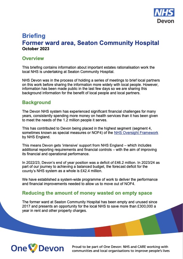 Following my request, the Devon Integrated Commissioning Board (ICB), successor to the CCG which closed Seaton Hospital’s ward in 2017, has made public the report which was used to make the decision on 4 October to potentially hand the ward building back to NHS Property Services, which could lead to its demolition. In the interests of public information I am publishing this in full. The first page is reproduced as a photo – the remainder of the report continues as text.