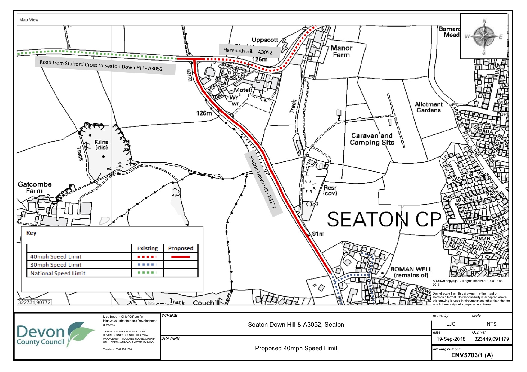 - Devon Highways have accepted in principle that the 40 mph restriction on Harepath Hill could be extended past the A3052 junction with Seaton Down Hill (because of problems of visibility at the junction and the need for pedestrians to cross from the carpark to the footpath towards Holyford Woods). This change would mean that Seaton Down Hill would also be subject to a 40 limit, as asked for by the Speed Watch team and Town Council. However funding remains to be discussed and the change will need to go through the usual formal approval process.